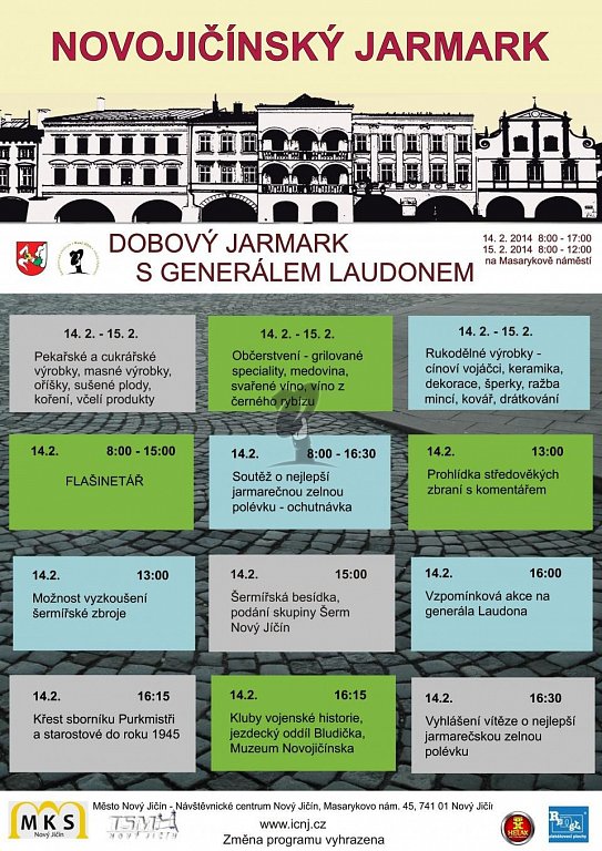 Přijměte pozvání na dobový jarmark s gen. Laudonem, který se uskuteční v pátek 14.2.2014 od 8:00 do 17:00 a v sobotu 15.2.2014 od 8:00 do 12:00 na Masarykově náměstí v NJ. Návštěvníkům nabídne pekařské výrobky, produkty z včelího vosku a medu, přírodní kosmetiku, rukodělné výrobky, cínové vojáčky a mnoho dalšího zajímavého zboží. Součástí jarmarku bude soutěž podnikatelů v gastronomii O nejlepší jarmarečnou polévku, kterou bude hodnotit široká veřejnost. Jarmarku se zúčastní kluby vojenské historie, jezdecký klub Bluička a Muzeum Novojičínska p.o. a na programu bude rovněž křest nové publikace Purkmistři a starostové do r.1945.
