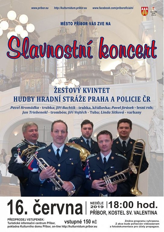 Příbor 16. 6. 2019 od 18:00 SLAVNOSTNÍ KONCERT ŽESŤOVÉHO KVINTETU HUDBY HRADNÍ STRÁŽE PRAHA A POLICIE ČR