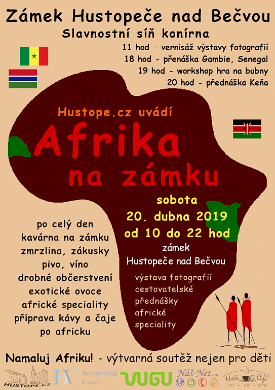 V sobotu 20. dubna 2019 přijďte na zámek v Hustopečích nad Bečvou zažít Afriku. V krásných prostorách zámecké konírny je připravena výstava fotografií a artefaktů z cest po Africe – Gambie, Senegal, Keňa, která vyvrcholí přednáškou 2 cestovatelů a autorů vystavených fotografií za doprovodu afrických bubnů. Po celý den bude připraveno občerstvení s možností ochutnávky specialit z Afriky.