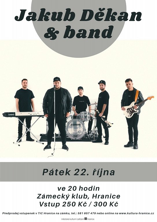 Koncert skupiny Jakub Děkan & band se uskuteční v pátek 22. října od 20:00 hodin v Zámeckém klubu. Cena vstupenky je 250 Kč v předprodeji, 300 Kč na místě. Předprodej vstupenek je v TIC Hranice na zámku do 22. října do 16:00 hodin nebo online.