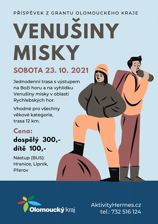 Olomoucký kraj v sobotu 23. října 2021 pořádá jednodenní výstup na Boží horu a na vyhlídku Venušiny misky v oblasti Rychlebských hor. Vhodné pro všechny věkové kategorie. Trasa je dlouhá 12 km. Cena je pro dítě 100 Kč a pro dospělého 300 Kč. Nástupní místa autobusu jsou v Hranicích, Lipníku nad Bečvou a v Přerově.
