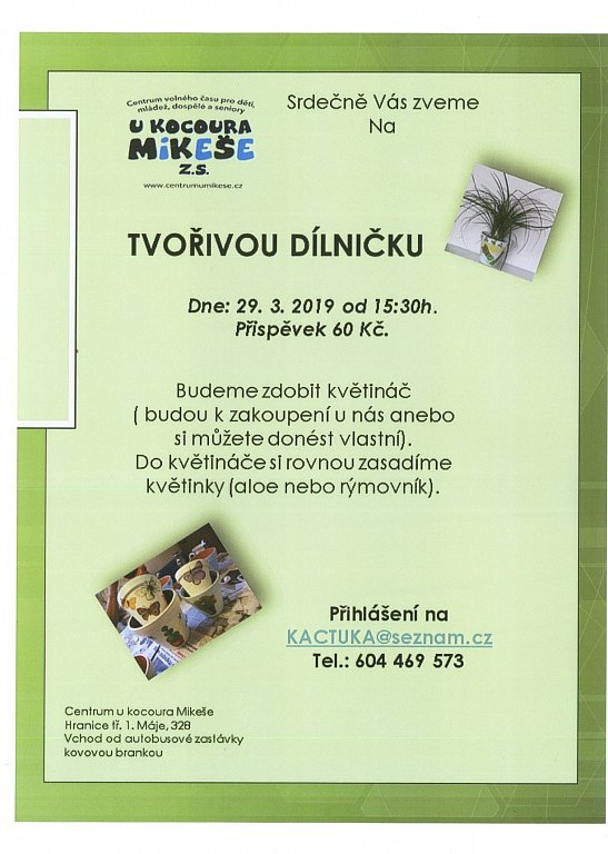 Tvořivá dílnička v Centru U Kocoura Mikeše se bude konat v pátek 29. března. Tentokrát se budou zdobit květináče a zároveň budete mít možnost si zasadit rostlinku rýmovníku nebo aloe vera. Květináč si můžete přinést s sebou nebo zakoupit přímo na místě. Příspěvek za materiál činí 60 Kč. Přihlášky na emailu: KACTUKA@seznam.cz nebo telefonu 604 469 573.