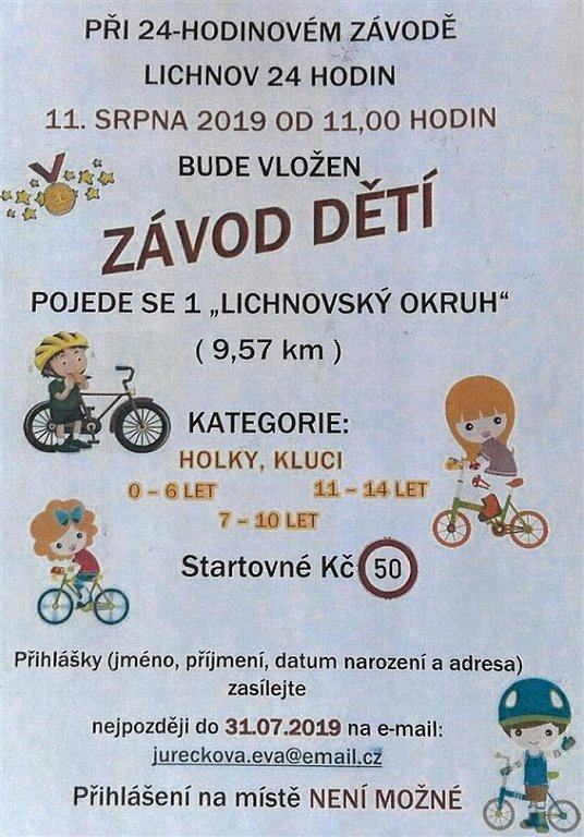 Frenštát pod Radhoštěm - Lichnov11. 8. 2019 od 11:00ZÁVOD DĚTÍ – PŘI 24-HODINOVÉM ZÁVODĚ „LICHNOV 24 HODIN“