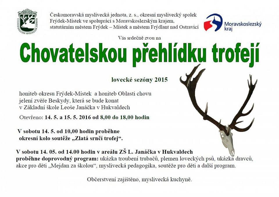 ČMMJ - Okresní myslivecký spolek Frýdek-Místek ve spolupráci s Moravskoslezským krajem, statutárním městem Frýdek-Místek a městem Frýdlant nad Ostravicí vás zvou na chovatelskou přehlídku trofejí lovecké sezóny 2015.