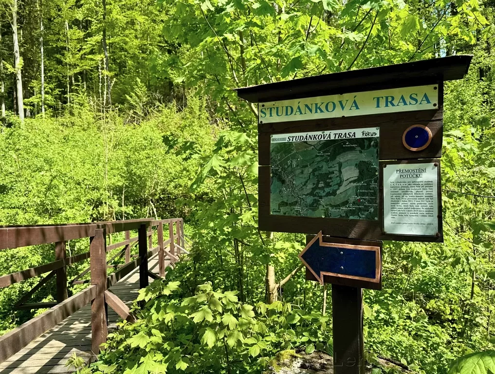 The trail starts with a signboard with its map in the upper area of the local part of Žilina (approximately 50 metres above the bus stop U Partyzana). The blue marking will lead you to a forest path along a gently ascending path. After less than a kilometre, the first beautiful view of Nový Jičín with the Oder Mountains in the background and, if conditions are excellent, the Jeseníky Mountains in the background. The trail then leads along a purpose-built road to the "gas station" and from there it leads to the first well on the trail, the oldest one called U Sovy. It got its name thanks to a 300-year-old linden tree inhabited by hermits. Unfortunately, the lime tree no longer grows at the well.