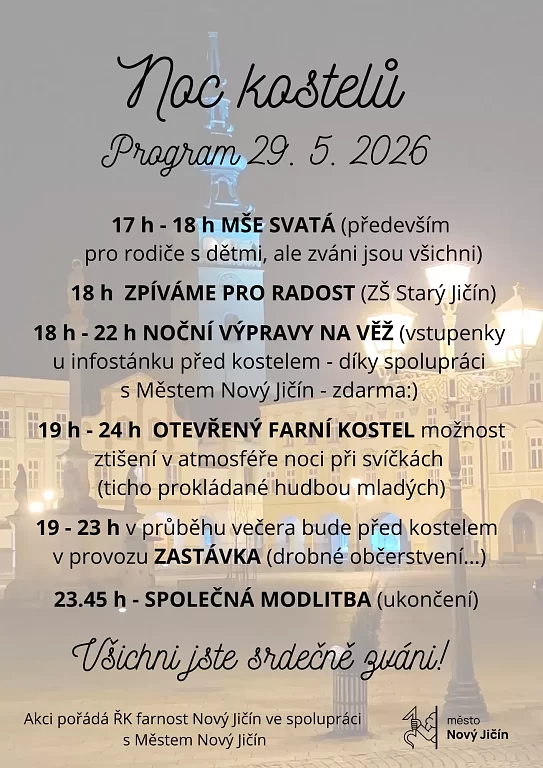 V rámci akce Noc kostelů vás zveme na noční výpravy na kostelní věž, které proběhnou v pátek 29. května 2026 od 18:00 do 22:00.