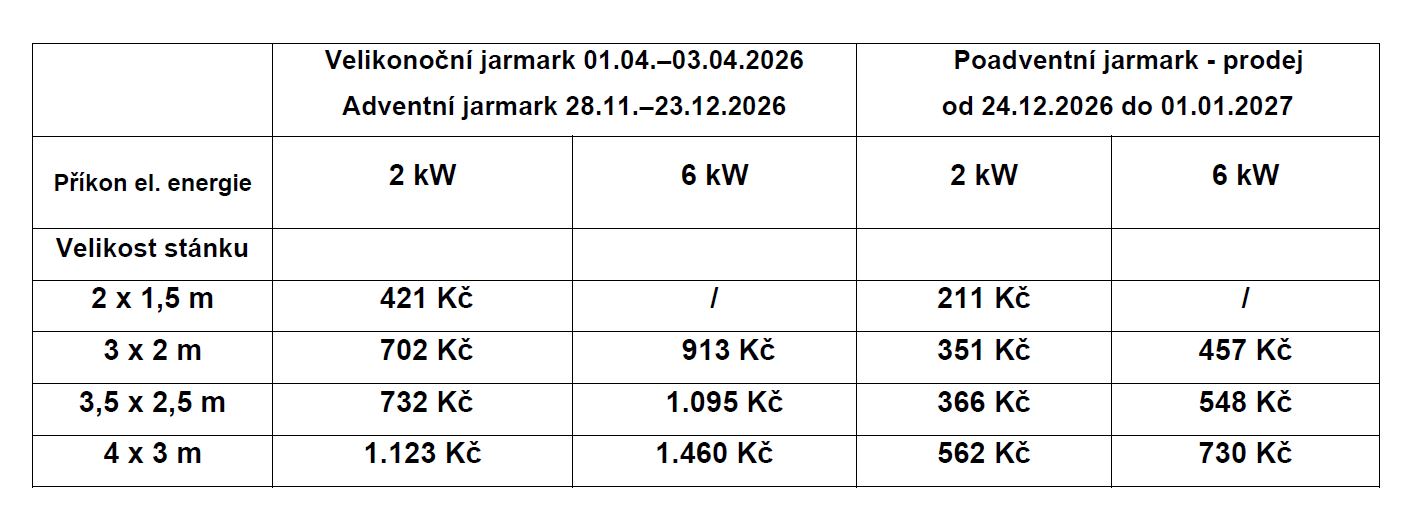 a.   poplatek ve výši 3.000 Kč včetně DPH/akce/prodejce s občerstvením (jídlo včetně alko a nealko nápojů) s připojením k el. energii (v poplatku zahrnuty náklady za pronájem elektrogenerátorů a vyčíslené náklady za spotřebovanou el. energii z el. sloupků na náměstí),