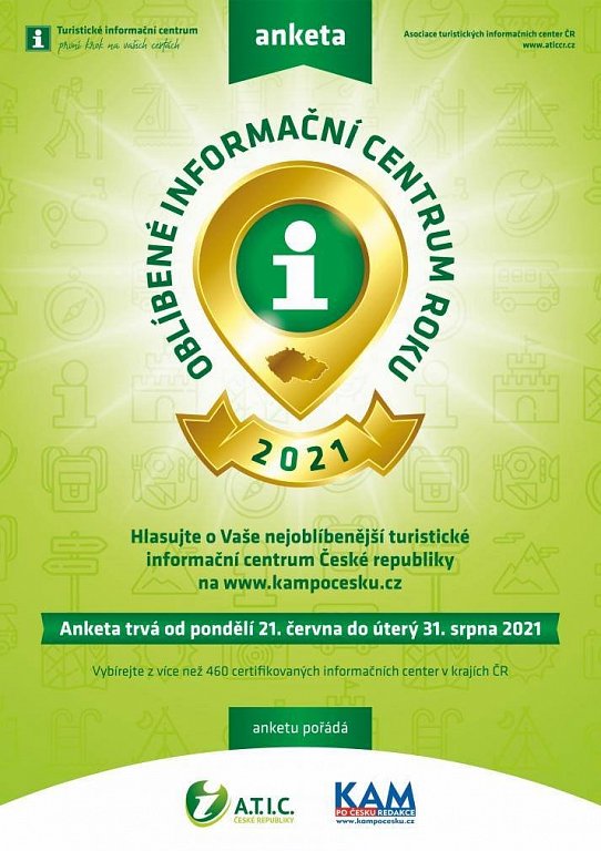 A.T.I.C. ČR vyhlašuje anketu popularity turistických informačních center. Anketu ve spolupráci s asociací zajistí společnost Kam po Česku s.r.o., na jejichž webových stránkách www.kampocesku.cz hlasování proběhne v období od 21. června, od 24.00 hod., do 31. srpna 2021. Informace o anketě budou zveřejněny na webu asociace www.aticcr.cz.