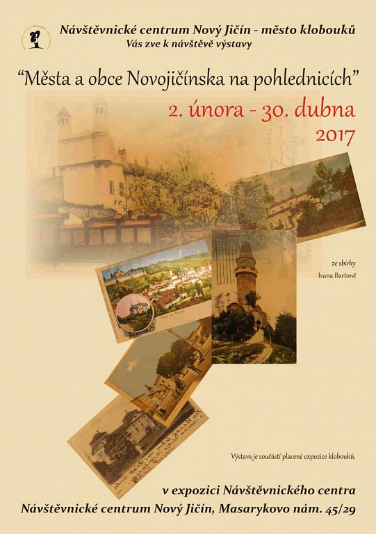 Zveme Vás na výstavu s názvem "MĚSTA A OBCE NOVOJIČÍNSKA NA POHLEDNICÍCH" ze sbírky Ivana Bartoně, která bude k vidění od 2. února do konce dubna 2017 v placené expozici klobouků Návštěvnického centra.