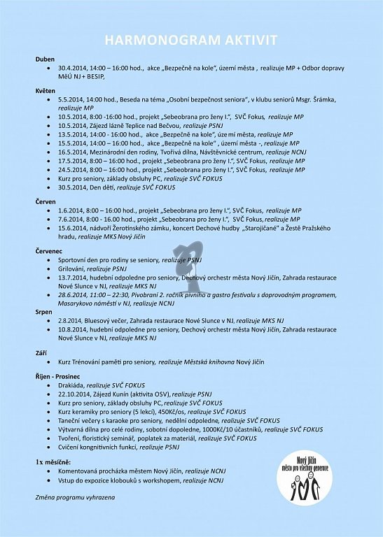 Aktivity budou realizovány v průběhu celého roku. Podrobné informace o uvedených programech, budou k nalezení na stránkách jednotlivých realizátorů, plakátech a facebooku města. Myšlenkou organizátorů je koncipovat takové akce, na kterých se mohou setkávat, poznávat a spolupracovat občané různých věkových kategorií.