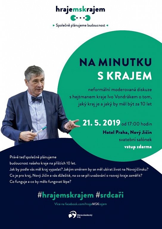 Právě teď společně plánujeme budoucnost našeho kraje na příštích 10 let. Přijďte o ní diskutovat s hejtmanem Moravskoslezského kraje. Jak by podle vás měl kraj vypadat? Jakým směrem by se měl ubírat život na Novojičínsku? Co je pro kraj, Nový Jičín a vás důležité, na co se při uvažování o rozvoji kraje zaměřit? Co funguje a co by mělo fungovat lépe? Jak zlepšit image kraje?