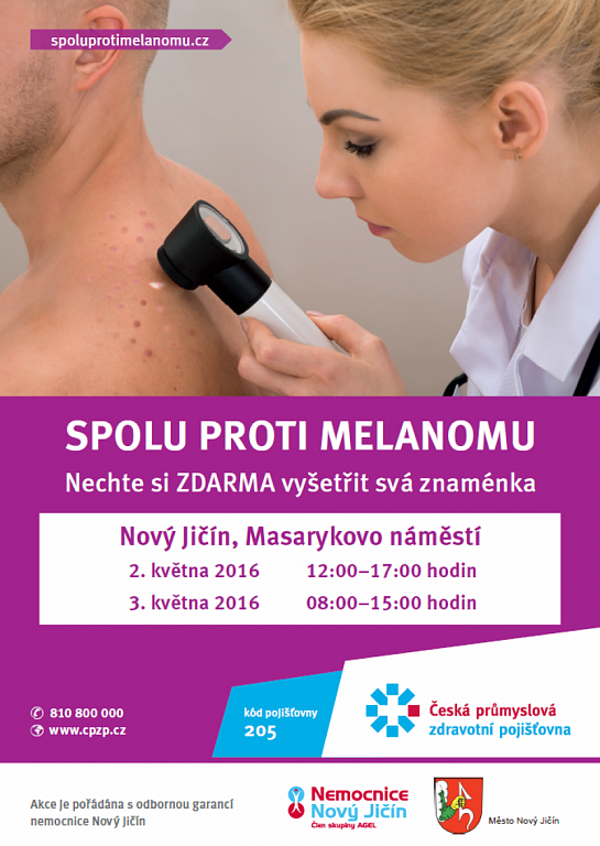 Zhoubný melanom je nádor kůže, který patří mezi nejzhoubnější druhy rakoviny. Je zákeřný tím, že začíná relativně brzy metastazovat do jiných orgánů. Česká průmyslová zdravotní pojišťovna připravila pro veřejnost vyšetření pigmentových znamének zcela zdarma. Vyšetření budou probíhat ve vybraných městech po celé ČR v rámci preventivní akce s názvem Spolu proti melanomu, www.spoluprotimelanomu.cz.