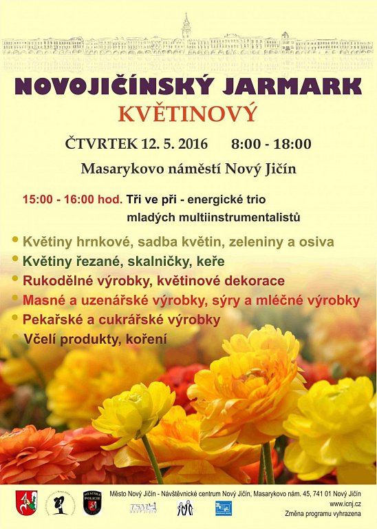 Ve čtvrtek 12.5. 2016 od 8:00 - 18:00 hod. na Masarykově náměstí v Novém Jičíně proběhne Novojičínský jarmark - Květinový.