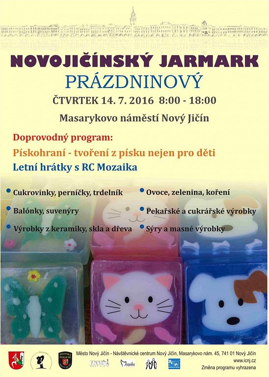 Jarmark se uskuteční ve čtvrtek 14.7.2016 od 8:00 do 18:00 hodin na Masarykově náměstí. Součástí jarmarku bude doprovodný program zahrnující Pískohraní - tvoření z písku a Letní hrátky s rodinným centrem Mozaika.