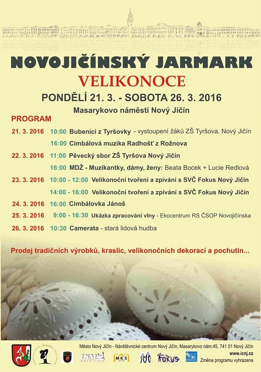 Přijďte se podívat na Novojičínský Velikonoční jarmark od pondělí 21. března do soboty 26. března každý den o 8:00 - 17:00. Jarmark nabídne nejen kulturní program a atrakce pro děti, ale také možnost zakoupnení velikonočních dekorací, kraslic, květin a ručně dělaných výrobků. Nebude chybět ani občerstvení, masné a uzenářské výrobky, sýry, velikonoční cukroví, pečivo a další dobroty.