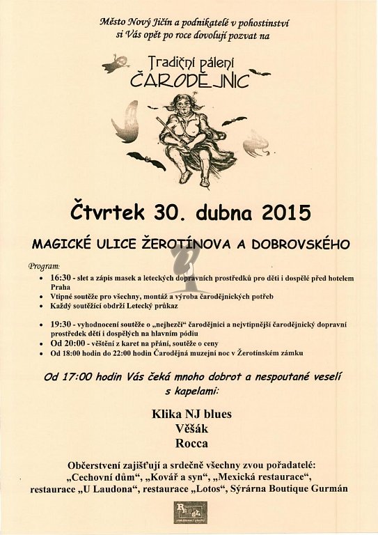 - 19:30 - vyhodnocení soutěže o „nejhezčí“ čarodějnici a nejvtipnější čarodějnický dopravní prostředek dětí i dospělých na hlavním pódiu