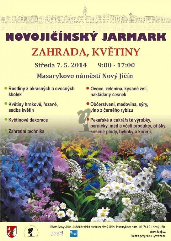 Návštěvnické centrum Nový Jičín si Vás dovoluje pozvat na Novojičínský jarmark, který proběhne ve středu dne 7.5. 2014 na Masarykově náměstí v Novém Jičíně. Návštěvníkům nabídne především květiny hrnkové, řezané, sadbu květin a květinové dekorace.
