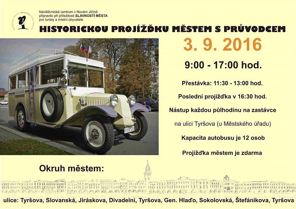 9:00 - 17:00 Komentované projížďky městem historickým autobusem, každou půlhodinu (přestávka 12:00 - 13:00), nástupní místo - ulice Tyršova, projížďka městem je zdarma, kapacita autobusu je omezena na 12 osob.