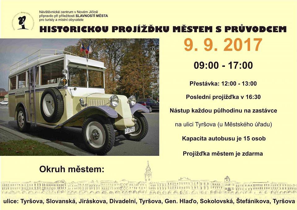 Každou půlhodinu, nástupní místo - ulice Tyršova (přestávka 12:00 - 13:00). Projížďka městem je zdarma. Kapacita autobusu je omezena na 15 osob.