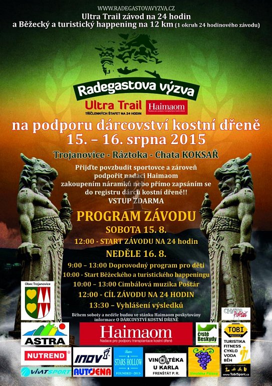 Druhý ročník horského běžeckého závodu s programem pro rodiny proběhne již příští víkend 15. – 16. srpna 2015 v Trojanovicích v Beskydech. Ojedinělý charitativní závod je pořádán na podporu dárcovství kostní dřeně, na pomoc nemocným s leukémií.Vyslyšet Radegastovu výzvu a udělat dobrý skutek můžete jednoduše i vy! Dva dny plné závodní atmosféry, dobročinnosti, pohody a zábavy jsou určeny celým rodinám, profi irekreačnímsportovcům.
