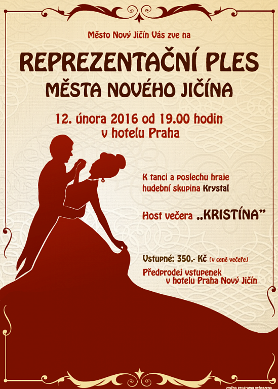 Zveme všechny na REPREZENTAČNÍ PLES MĚSTA NOVÉHO JIČÍNA, dne 12. února 2016 od 19:00 hod. v hotelu Praha. Hostem večera bude slovenská zpěvačka "Kristína".