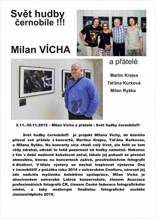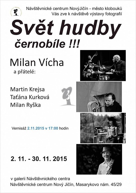 Návštěvnické centrum Nový Jičín - město klobouků, Milan Vícha (člen Asociace profesionálních fotografů ČR), autor výstavy a jeho přátelé (Martin Krejsa, Taťána Kurková, Milan Ryška) si Vás dovolují pozvat na výstavu fotografií s názvem „Svět hudby černobíle !!! „