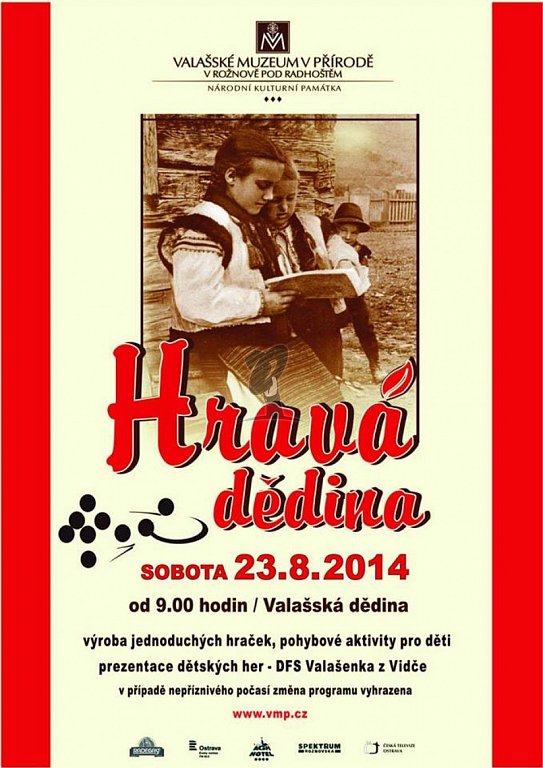 Návraty do zmizelého světa dětských her přinese pořad Hravá dědina v sobotu 23. srpna v areálu Valašské dědiny. Areál otevřen veřejnosti od 9.00 do 18.00. Více na http://www.vmp.cz/cs/uvod/kalendar-akci/hrava-dedina.html