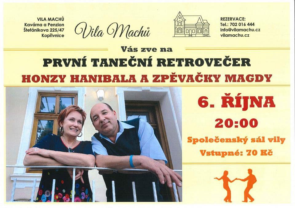 První taneční retrovečer s Honzou Hanibalem a zpěvačkou Magdou ve společenském sále vily.