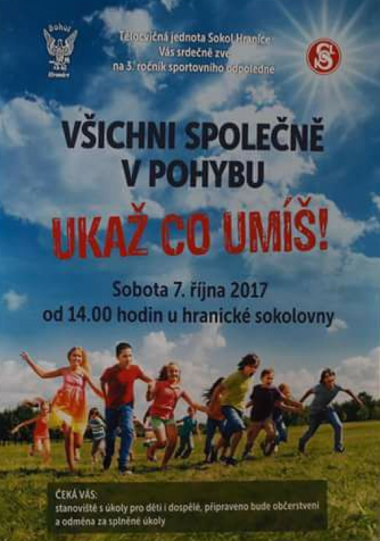 3. ročník sportovního odpoledne "Všichni společně v pohybu". Čeká Vás stanoviště s úkoly pro děti i dospělé, připraveno bude občerstvení a odměna za splněné úkoly.
