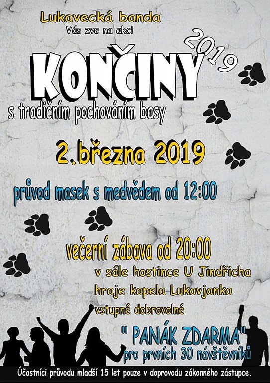 Akce Končiny s tradičním pochováním basy. Průvod masek s medvědem od 12:00. Večerní zábava od 20:00 v sále Hostince u Jindřicha. Hraje kapela Lukavjanka. Panák zdarma pro prvních 30 návštěvníků.