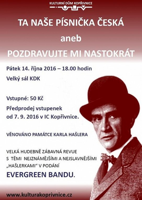 Kopřivnice 14. 10. 2016 od 18:00 TA NAŠE PÍSNIČKA ČESKÁ ANEB POZDRAVUJTE MI NASTOKRÁT