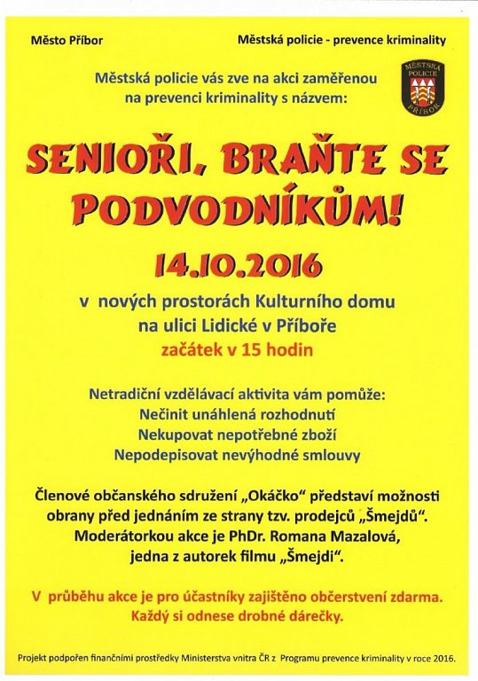 Příbor 14. 10. 2016 od 15:00 SENIOŘI, BRAŃTE SE PODVODNÍKŮM