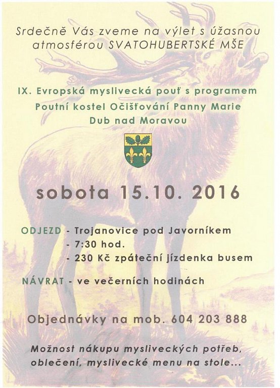 Trojanovice 15. 10. 2016 v 7:30 IX. EVROPSKÁ MYSLIVECKÁ POUŤ - Poutní kostel Očišťování Panny Marie Dub nad Moravou