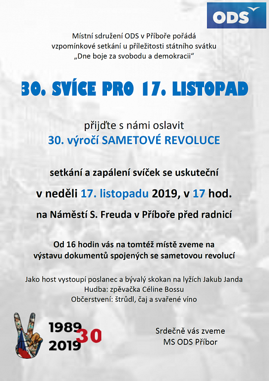 Místní sdružení ODS Příbor zve všechny občany na tradiční setkání se svíčkami u příležitosti 30. výročí sametové revoluce. Sejdeme se v neděli 17. listopadu v 17. hodin na náměstí u radnice. Bližší informace naleznete na plakátu.