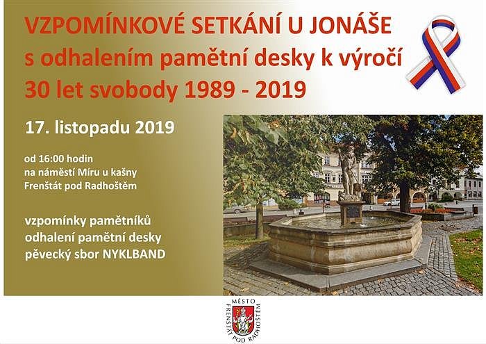 Frenštát pod Radhoštěm 17. 11. 2019 od 16:00 VZPOMÍNKOVÉ SETKÁNÍ U JONÁŠE S ODHALENÍM PAMĚTNÍ DESKY K VÝROČÍ 30 LET SVOBODY 1989 – 2019