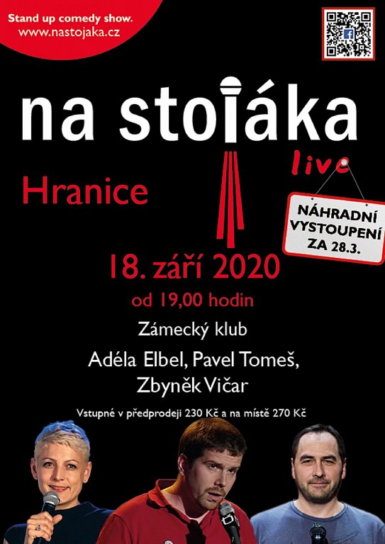 Oblíbená stand up comedy show Na Stojáka se bude konat v pátek 18. září od 19:00 hodin v Zámeckém klubu v Hranicích. Jedná se o náhradní termín zrušeného představení, které se mělo konat na jaře. Zakoupené vstupenky zůstávají v platnosti.