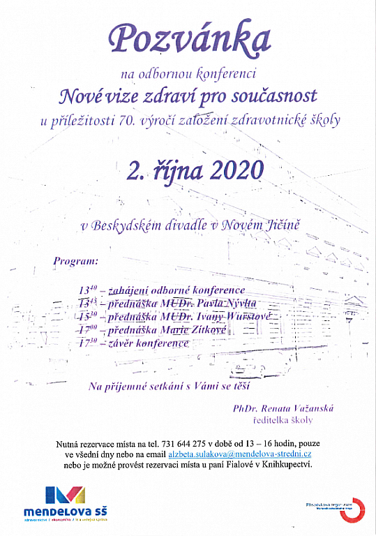 Pozvánka na odbornou konferenci u příležitosti 70. výročí založení zdravotnické školy.