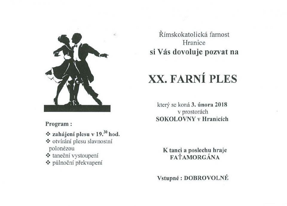 Římskokatolická farnost Hranice zve všechny na tradiční, letos již dvacátý ročník Farního plesu, vstupné na ples je dobrovolné. Ples bude zahájen v 19:30 hodin v Sokolovně v Hranicích. Poté bude zahájena slavnostní polonéza a v průběhu večera se můžete těšit na taneční vystoupení a půlnoční překvapení. K tanci a poslechu bude hrát skupina Faťamorgána. Výtěžek z plesu bude věnován mládeži a část výtěžku z tomboly je vždy věnována na charitní činnost.