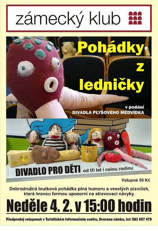 Loutkové představení s názvem Pohádky z ledničky se uskuteční v neděli 4. února od 15:00 hodin v Zámeckém klubu. Pohádka nabídne zábavu i poučení. Herec Konrád Popel s herečkou a hudebnicí Marinou Ra z Divadla plyšového medvídka hravou formou upozorní na stravovací a hygienické návyky. Děti se mohou těšit na mlsouny Káju a Boženku, paštiku Majdu, sýra Emila nebo rajče, prostě rajče.