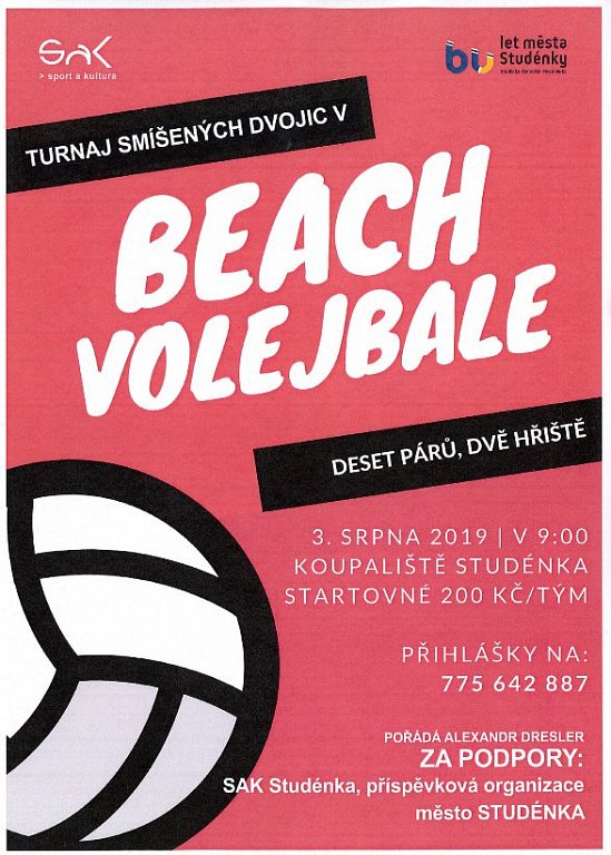 Studénka 3. 8. 2019 od 9:00 BEACH VOLEJBAL – TURNAJ SMÍŠENÝCH DVOJIC