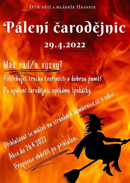 V pátek 29. dubna 2022 proběhne Pálení čarodějnic s Domečkem. Přihlašovat se můžete na stránkách https://www.ddmhranice.cz/akce do 26. 4. Propozice obdržíš po přihlášení.