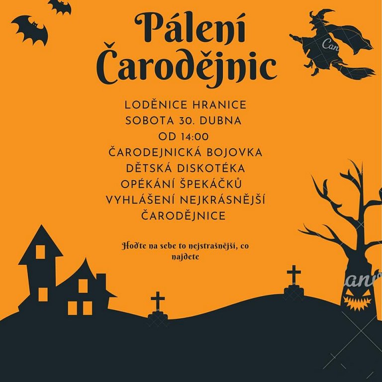 V sobotu 30. dubna 2022 proběhne na Loděnici Hranice od 14:00 odpolední zábavný program. Těšit se můžete na čarodějnickou stezku, na které budou děti plnit tajemné úkoly. Stezka je určena pro děti od 4 let. Za splnění stezky dostane každý špekáček, který si může sám opéct a pitíčko. Po celé odpoledne bude hrát Dj Martin dětskou diskotéku. V 18:00 hodin proběhne vyhlášení nejhezčí čarodějnice.