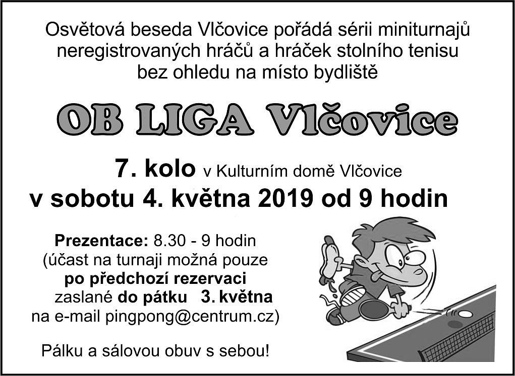 Kopřivnice 4. 5. 2019 od 9:00 TURNAJ: OTEVŘENÝ TURNAJ VE STOLNÍM TENISE – OB LIGA VLČOVICE 7. KOLO