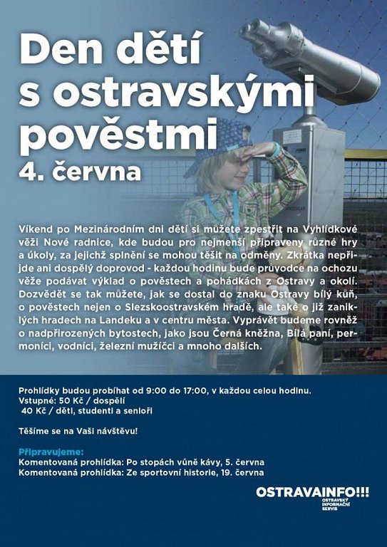 Víkend po Mezinárodním dni dětí si můžete zpestřit na Vyhlídkové věži Nové radnice, kde budou pro nejmenší připraveny různé hry a úkoly, za jejichž splnění se mohou těšit na odměny. Zkrátka nepřijde ani dospělý doprovod - každou hodinu bude průvodce na ochozu věže podávat výklad o pověstech a pohádkách z Ostravy a okolí. Dozvědět se tak můžete, jak se dostal do znaku Ostravy bílý kůň, o pověstech nejen o Slezskoostravském hradě, ale také o již zaniklých hradech na Landeku a v centru města. Vyprávět budeme rovněž o nadpřirozených bytostech, jako jsou Černá kněžna, Bílá paní, permoníci, vodníci, železní mužíčci a mnoho dalších.