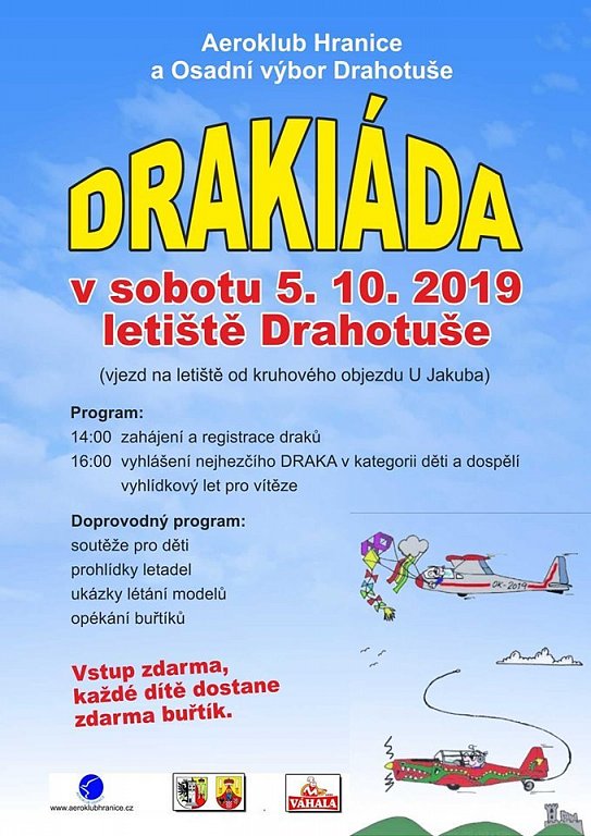 Tradiční Drakiáda Aeroklubu Hranice a Osadního výboru Drahotuše se bude konat v sobotu 5. října od 14:00 hodin.