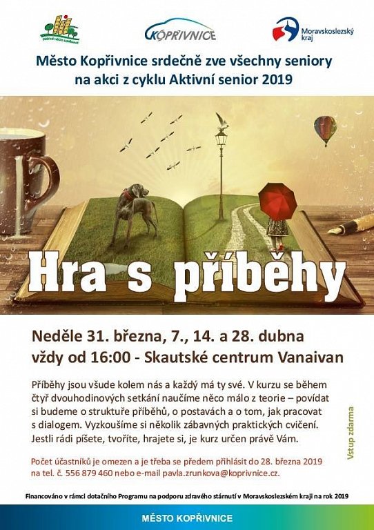 Lekce základů tvůrčího psaní z cyklu Aktivní senior 2019. Příběhy jsou všude kolem nás a každý mí ty své. V kurzu se během čtyř dvouhodinových setkání naučíme něco málo z teorie - povídat si budeme o struktuře příběhů, o postavách a o tom, jak pracovat s dialogem. Vyzkoušíme si několik zábavných praktických cvičení. Jestli rádi píšete, tvoříte, hrajete si, je kurz určen právě Vám. Počet účastníků je omezen a je třeba se předem přihlásit do 28. března 2019 na tel.: 556 879 460 nebo na e-mailu: pavla.zrunkova@koprivnice.cz