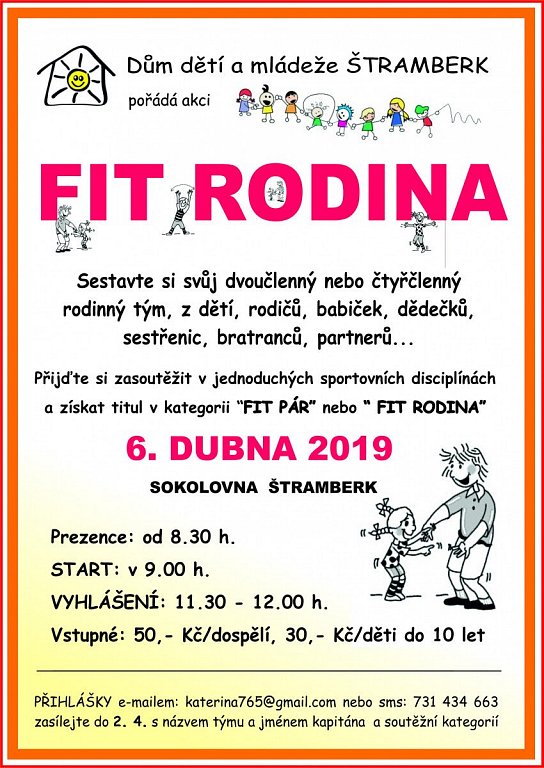 Soutěž v jednoduchých sportovních disciplínách. Sestavte si svůj dvoučlenný nebo čtyřčlenný rodinný tým z dětí, rodičů, babiček, dědečků, sestřenic, bratranců, partnerů. Přijďte si zasoutěžit v jednoduchých sportovních disciplínách a získat titul v kategorii "FIT PÁR" nebo "FIT RODINA". Prezence: od 8:30; start: 9:00; vyhlášení: 11:30 - 12:00. Přihlášky zasílejte e-mailem: katerina765@gmail.com nebo smskou na tel: 731 434 663.