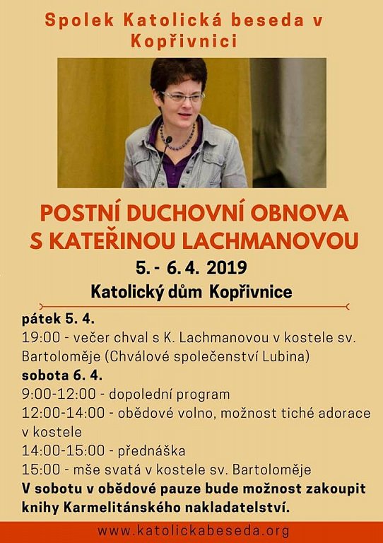 Kopřivnice 6. 4. 2019 od 09:00 POSTNÍ DUCHOVNÍ OBNOVA S KATEŘINOU LACHMANOVOU