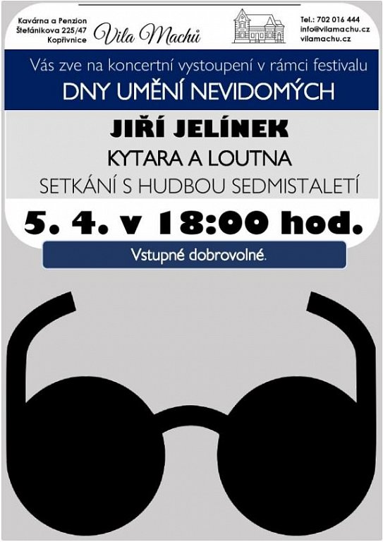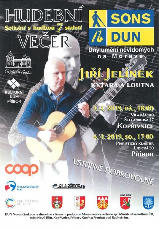 Nejen očima lze vnímat krásu. I bez zraku lze tvořit a rozdávat radost. Přesvědčit se o tom mohou lidé na Moravě a ve Slezsku v rámci festivalu Dny umění nevidomých, které probíhají v Kopřivnici, Příboře, Novém Jičíně, Frenštátě pod Radhoštěm a Kuníně. Hraje a slovem provází Jiří Jelínek, absolvent konzervatoře Jana Deyla pro zrakově postižené, učitel hry na kytaru a varhany v ZUŠ. Hudebně spolupracuje s několika divadelními ochotnickými soubory, hraje při vernisážích výstav, na koncertech učitelů aj. Zahraje na kytaru a loutnu.