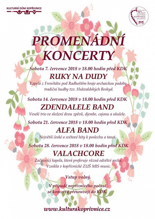 Promenádní koncert určený široké veřejnosti. Koncert se uskuteční každou červencovou sobotu v místech před KDK. K Prostranství před KDKoncerty budou čtyři a na každém z nich vystoupí jiná hudební kapela.